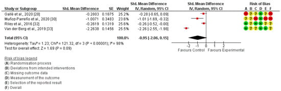 In-school SB was measured in four studies [28,30,32,33]. The meta-analysis revealed that interrupting prolonged sitting with active-based interventions was not enough to acquire a significant reduction in in-school SB (SMD = −0.95; 95% CI: −2.06, 0.15; I²: 98%) (Figure 3).