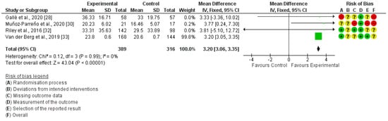 In-school MVPA was measured in five studies [28,30,32,33,34], but only four of them were included in the quantitative synthesis [28,30,32,33]. The meta-analysis showed the studied interventions produced a significant improvement in in-school MVPA (MD = 3.20; 95% CI: 3.06, 3.35; I²: 0%) (Figure 4). In the study by Watson et al. [34], the measurement of MVPA during the school day was performed using a waist-worn ActiGraph GT3-X accelerometer. No differences between the groups were found (B = 0.30; 95% CI: −0.18, 0.78).