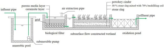 The bio–ecological combined process used in this study was mainly composed of an anaerobic tank, biological filter, constructed wetland, oxidation pond, and some supporting facilities. The area of the whole wastewater treatment facility was about 160 m2, and the design water inflow was 12 m3/d (Figure 1).