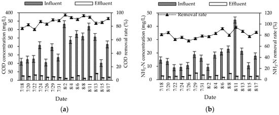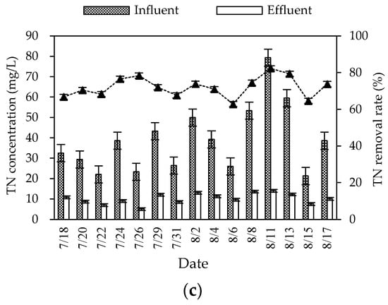 During the summer experiment period (mainly from July to August), the air temperature and water temperature were 26–34 °C and 25–30 °C, respectively. The pH and DO were 6.8–8.0 and 2.9–6.1 mg/L, respectively. The overall purification effect of the summer combined system on the three wastewater indicators was significant (Figure 2). The average removal rates of COD, NH3–N, and TN were 87.57, 80.98, and 72.18%, respectively. The mass concentration of COD, NH3–N, and TN in influent were 101.83–332.30, 8.94–44.75, and 21.28–79.38 mg/L, respectively. Different from the fluctuation of the influent concentration, the effluent concentration was stable at a low state. The average effluent concentration reached the first-class A discharged standard of “Discharge standard of pollutants for municipal wastewater treatment plant” (GB 18918-2002) (the mass concentrations of COD, NH3–N, and TN in the effluent are not higher than 50, 5, and 15 mg/L). The effluent quality was stable, since the combined process of the regulating tank, biofilter, constructed wetland, and ecological purification pond could effectively buffer, regulate, and degrade wastewater.