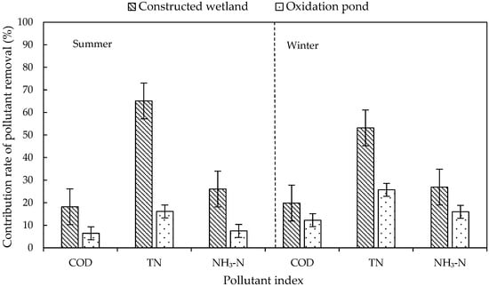 The ecological units in the system included constructed wetlands and oxidation ponds. The contribution rates of the ecological units to pollutant removal in summer and winter are shown in Figure 4. The contribution rate of ecological units to TN removal was significantly higher than that of biological units in both summer and winter, and the contribution of constructed wetland to TN removal was the largest (65.08% in summer and 53.15% in winter), which was mainly due to the alternation of aerobic, anoxic, and anaerobic environments in the wetland. In this environment, denitrifying bacteria could play a full role, and plants in the wetland could also absorb part of the inorganic nitrogen.