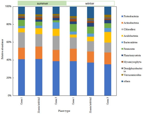 In order to further analyze the difference in the removal effect of ecological units, especially the wetland system under seasonal changes, and study the difference in the composition and structure of the microbial community in the wetland system, the relative abundance at phylum level of the microbial community in the wetland system was obtained through sequencing analysis. In order to facilitate the analysis of microbial community at all levels of wetlands, phyla with relative abundance higher than 2% were selected as the main phyla.