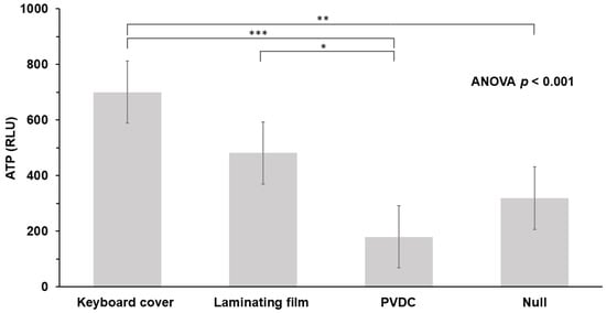 Values of ATP on two different plastic films, PVDC wrap and uncovered panel (null). ATP, adenosine triphosphate; RLU, relative light unit; PVDC, polyvinylidene chloride; * p < 0.05, ** p < 0.01, *** p < 0.001.