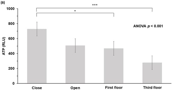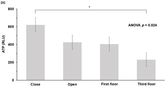 ATP values measured at one-hour intervals were highest for door-close buttons (620.7 ± 489.3 RLU), followed by door-open buttons (424.8 ± 223.7 RLU), first-floor (404.8 ± 387.5 RLU), and third-floor buttons (230.7 ± 277.6 RLU) (p = 0.024, ANOVA) (Table 2, Figure 2A). At the three-hour time point, our results were: door-close (727.4 ± 482.3 RLU), door-open (505.9 ± 262.9 RLU), first-floor (468.1 ± 356.8 RLU), and third-floor buttons (277.8 ± 288.4 RLU) (p < 0.001, ANOVA) (Table 2, Figure 2B).