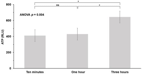 Values of ATP at different time points: ten minutes, one hour, and three hours. ATP, adenosine triphosphate; RLU, relative light unit; ns, no significance; * p < 0.05.