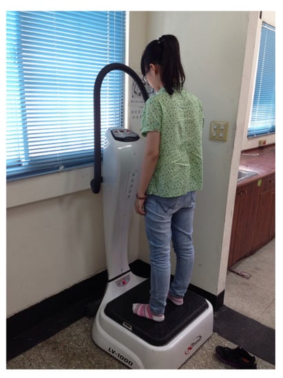 Whole-body vibration (WBV) training is a novel exercise method that takes place on a vibrating platform that generates continuous sinusoidal vibrations transmitted from the feet to the entire body to stimulate receptors in the body and create modulating effects. Vibratory stimuli were first documented to reduce the tone of spastic muscles [20]. Subsequent studies in the 1990s found that vibratory stimuli can help competitive athletes gain power and enhance sports performance during training [20]. In recent years, numerous animal and clinical studies have demonstrated the positive effects of WBV exercise on bone density and blood circulation in the lower extremities [21,22]. With regard to neuromuscular performance, studies have shown that WBV exercise enhances the muscle strength [23], flexibility [24], and sports performance [25] of athletes and typical adults alike. Additionally, WBV functions as a quick way of warming up before an exercise or training session and reduces pain caused by delayed onset muscle soreness (DOMS) [26]. Numerous studies have revealed the positive effects of WBV exercises on the balance abilities and functional performance of elderly groups [17,18], in addition to being a safe and convenient form of exercise [27]. WBV has been included in exercise therapies for stroke and multiple sclerosis patients [28,29].