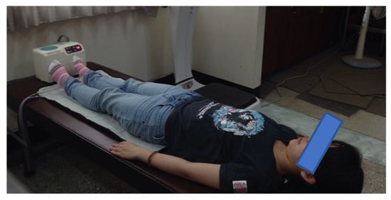 Intervention conditions: Eligible participants were randomly assigned to three experimental groups and a control group. The vibration instrument used in this study was a commercial-grade WBV training machine (LV-1000, X-trend, Taiwan). Participants were randomly assigned to a WBV group (20 Hz, n = 20), a WBV plus heat therapy group (20 Hz + heat, n = 22), a heat therapy alone group (n = 21), and a control group (n = 17). The mode of vibration was fixed sinusoidal waves (amplitude: 0–4 mm). Participants trained for five minutes while standing in a natural position. Participants who underwent WBV stood on the training machine thrice weekly for three consecutive months (see Figure 1). A thermal group was added after vibration training was performed. Those who underwent heat therapy rested the back of their lower extremities (hamstrings and gastrocnemii) on a circulating water heating pad maintained at 40 °C for 20 min (CW89 WiPOS, Taiwan) (Figure 2) [38,39]. The control group was used only for measurements and to monitor exercise habits.