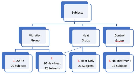 As shown in Figure 3, the study sample comprised 80 middle-aged and elderly participants. The participants were randomly assigned to a WBV training group (20 Hz, n = 20), a WBV training plus heat therapy group (20 Hz + heat, n = 22), a heat therapy alone group (n = 21), and a control group (n = 17).
