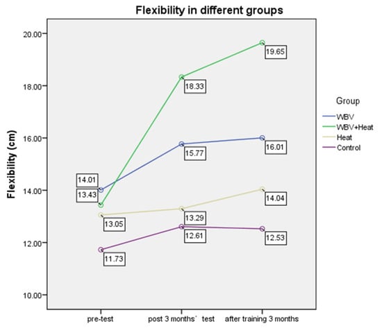 In terms of flexibility, significant pretest and posttest differences in flexibility were observed in the WBV and WBV plus heat therapy groups. The latter’s degree of improvement was significantly higher than that of the other three groups in three months (p = 0.007) (see Figure 4; Table 2).