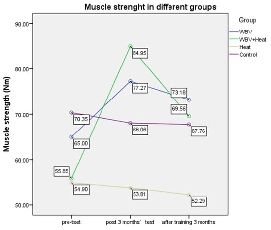 In terms of muscle strength, no significant differences in muscle strength were observed in the heat therapy alone and control groups. A significant improvement in muscle strength was observed in the WBV and WBV plus heat therapy groups. The latter’s degree of improvement was significantly higher than those of the other three groups (see Figure 5; Table 3).