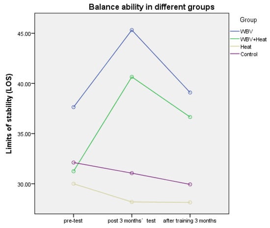 In terms of balancing abilities, no significant differences in balance abilities were observed in the heat therapy alone and control groups. And our study finding significant improvements in balance abilities were observed in the WBV and WBV plus heat therapy groups (see Figure 6; Table 4).