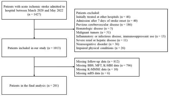 Stroke severity was measured on admission using the National Institutes of Health Stroke Scale (NIHSS). The NIHSS is a stroke severity measurement scale consisting of 11 items that evaluate the level of consciousness, gaze, visual fields, facial palsy, motor arm, motor leg, ataxia, sensory, language, dysarthria, extinction, and inattention [16]. Patients were categorized into two groups based on their NIHSS scores at admission: moderate-to-severe stroke (≥5 points) and mild stroke (<5 points) [17]. All patients underwent physical function and cognitive tests within 2 weeks of stroke onset. Cognitive function was evaluated using the K-MMSE, a Korean version of the MMSE that evaluates seven areas: time orientation, spatial orientation, memory registration, attention and calculation, memory recall, language, and space-time configuration. Total scores on the K-MMSE range from 0 to 30, with scores ≤ 23 defined as unfavorable outcomes because they indicate cognitive impairment [18]. Dynamic balance was evaluated using the BBS, a valid and reliable instrument for measuring both the static and dynamic aspects of balance in both the elderly and in stroke patients. BBS scores range from 0 to 56 points, with higher scores reflecting better balance. BBS scores ≤ 40 are indicative of a higher fall risk and are considered unfavorable outcomes [19]. ADL performance was evaluated using the K-MBI, a Korean version of the MBI that evaluates an individual’s degree of independence. The MBI covers 10 domains of functioning (activities): bowel control; bladder control; need for help with grooming, toilet use, feeding, transfers, walking, dressing, climbing stairs, and bathing [20]. K-MBI scores ≤ 60 indicate severe to total dependence on assistance, and were defined as unfavorable outcomes [21]. The mRS score, which reflects general disability and stroke patients’ need for assistance, was also evaluated at discharge. An mRS score ≥ 3 was defined as an unfavorable outcome, as it represents moderate-to-severe disability [22]. The MFT of the hemiplegic hand was also evaluated within 2 weeks of stroke onset. The MFT, which evaluates the motor function of the upper extremities in stroke patients, consists of eight items, including forward elevation of the arm, lateral elevation of the arm, touching the occiput with the palm, touching the back with the palm, grasping, pinching, carrying cubes, and pegboard manipulations. Total scores range from 0 to 32 points [23], with MFT scores ≤ 13 indicating unfavorable outcomes [24]. The BBS, MFT, K-MMSE, K-MBI, NIHSS, and mRS were evaluated in patients by experienced therapists and clinicians. The study protocol was approved by the Institutional Review Board of Kyung Hee University Hospital (KHUH 2022-09-024), which waived the requirement for written informed consent due to the retrospective nature of this study.