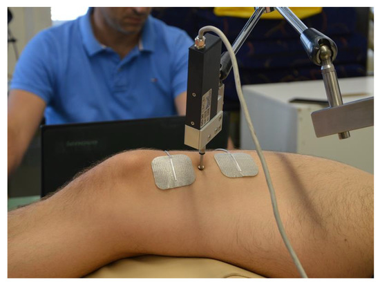 Measurements were taken under isometric conditions. Electrodes (Pals Platinum, model 895220 with a multi-stick gel, Axelgaard Manufacturing Co., Ltd., Fallbrook, CA, USA) were positioned inside muscle borders (proximally and distally) and the sensor (GK40, Panoptik, Ljubljana, Slovenia) location was at the midpoint between both electrodes, at the center of the muscle belly (Figure 1) [37]. After positioning the electrodes, electrical stimuli (TMG 100—TMG-BMC d.o.o., Ljubljana, Slovenia) was given (10 mA) and repeated at 5 s intervals [21]. The current increase was 20 mA until reaching the supramaximal muscle response (90–110 mA) [38]. The total duration of the procedure for both legs in a single subject was between 8 and 12 min. No discomfort was complained of by the subjects.