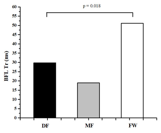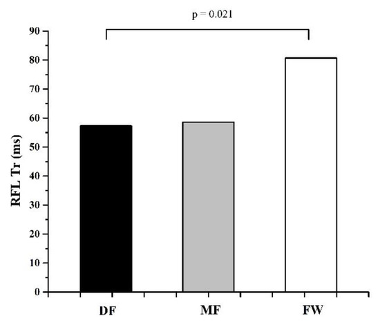 Table 1 and Table 2 represent the descriptive values of measured parameters and results of ANOVA, while Figure 2, Figure 3, Figure 4, Figure 5 and Figure 6 represent the results of the Bonferroni post hoc test in those parameters that showed significant differences between groups. It was noted that only 5 of 50 variables (10%) showed significant differences between groups. Differences in TMG parameters between top-level football players of different playing positions were observed in Tr of RF (F = 4.658, p = 0.014) BF (F = 4.433, p = 0.016), and ST muscle (F = 3.808, p = 0.028), Tc (F = 3.214, p = 0.048) and Td (F = 3.705, p = 0.031) of the VM muscle. All significant differences were observed in the TMG parameters of the left leg. There were no significant differences between groups in other measured parameters (F = 1.276, p = 0.491, on average). The Bonferroni post hoc test results showed that all significant differences appear only between defense and forward players.