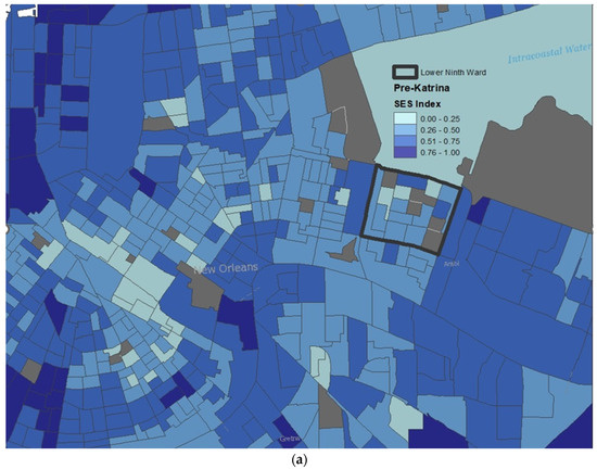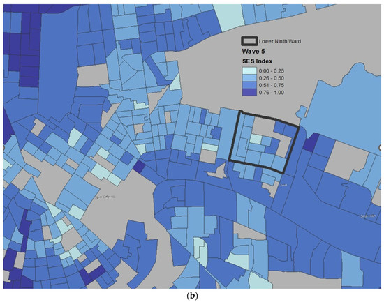 Thematic visualization of neighborhood socioeconomic index (SES) score in New Orleans at (a) Pre-Katrina (2005) and at (b) Wave 5 (2015). Darker gradients suggest relatively increased SES at the census block group level.