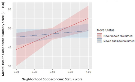 The exposure of interest, neighborhood SES, was positively associated with MCS in our intermediate model though not statistically significant. The confidence interval indicates this association is partially significant. The results from the final model for our analysis, in which we assessed for interaction between residential mobility and neighborhood SES score, are shown in Table 3. In this final model, we observed a statistically significant coefficient for neighborhood SES score, after including the interaction term for move status. For those who did not move or eventually returned to their pre-Katrina neighborhood, every unit increase in neighborhood SES score was associated with an estimated increased mean MCS score by 19.6 (95% CI: 5.8, 33.7). In other words, mental health score improved as neighborhood SES increased for those who did not move or eventually returned to their pre-Katrina neighborhood, controlling for all other variables. The interaction term between neighborhood SES score and move status was statistically significant, suggesting that the effect of neighborhood SES on MCS was modified by move status. The coefficient for this interaction term, −13.14 [95% CI: −27.92, 1.63], further indicates that the positive relationship between neighborhood SES and MCS was attenuated among those who moved and did not return compared to those who did not move or eventually returned to their pre-Katrina residence. Based on the p-value of the interaction coefficient, the effect of neighborhood SES on mental health was modified by move status. To further interpret these findings in a more tangible sense, Figure 2 presents a marginal effects plot to visualize this interaction, how the estimated effect of neighborhood SES varies by move status. A marginal effects plot allows one to interpret results from the statistical model by presenting the estimated predicted values generated by the model [34]. These predictions compare how the outcome, MCS score, changes on average, holding the non-focal variables constant. In this figure, MCS scores increase over time for both slopes. Regardless of move status, mental health was predicted to improve for both groups. However, the slope of those who never moved or returned to their pre-Katrina neighborhood is steeper than the slope of those who moved and never came returned, emphasizing the significance of the interaction. Those who never moved or returned to their pre-Katrina residence have a predicted higher average rate of increase in MCS score (mental health improvement) than those who moved away from their pre-Katrina residence in the 10 years following Hurricane Katrina. Our final model demonstrates that the effect of neighborhood socioeconomic status is different for those who moved away than those who never moved or eventually returned to their pre-Katrina neighborhoods.