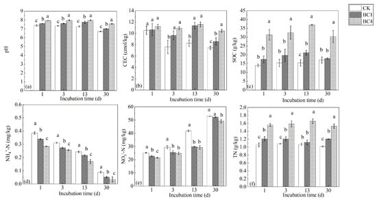 The effects of biochar addition on soil (a) pH, (b) CEC, (c) SOC, (d) NH4+-N, (e) NO3−-N and (f) TN during the 30-day incubation. Different letters indicate significant variations among treatments at the same incubation time at p < 0.05. Vertical bars indicate the standard error of the mean (n = 3).