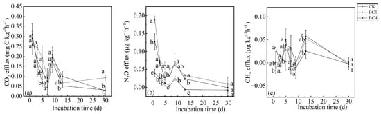 The effects of biochar addition on soil (a) CO2, (b) N2O and (c) CH4 effluxes during the 30-day incubation. Different letters indicate significant variations among treatments at the same incubation time at p < 0.05. Vertical bars indicate the standard error of the mean (n = 3).