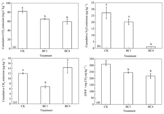 Compared with CK, BC1 and BC4 significantly reduced the cumulative CO2 emissions by 20.7% and 28.0% during the whole incubation, while there was no significant difference between BC1 and BC4 (Figure 3a). Compared with CK, BC1 and BC4 reduced the cumulative N2O emissions by 25.6% and 95.4%, while the difference between BC1 and CK was not significant. It should be noted that BC4 treatment was significantly lower than CK and BC1 (Figure 3b). Compared with CK, BC1 significantly reduced CH4 emissions by 43.6%, and BC4 increased CH4 emissions by 19.3% and the difference between BC4 and CK was not significant (Figure 3c). Compared with CK, BC1 and BC4 significantly reduced the GWP by 20.8% and 29.3%; the GWP of BC4 was 10.7% lower than that of BC1, but there was no significant difference between them (Figure 3d).