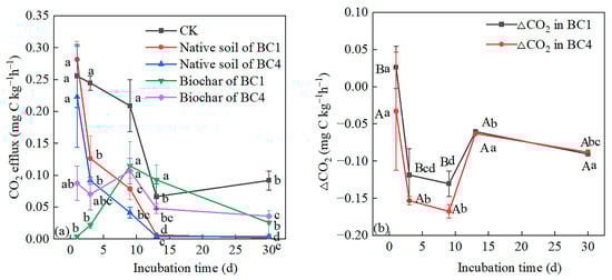 At the beginning of the incubation period, soil CO2 effluxes of biochar treatments (BC1 and BC4) were higher than CK, but the differences were not significant. As the incubation time increased, the soil CO2 effluxes of BC1 and BC4 treatments were lower than those of CK, and BC1 and BC4 treatments were significantly different from CK on the 30th day, while there was no significant difference between BC1 and BC4 (Figure 2a). The soil CO2 efflux of the BC1, BC4 and CK treatments showed a similar change pattern with the incubation time, i.e., soil CO2 efflux decreased rapidly with the incubation time before the 7th day, but increased on the 9th day, and then continued to decline. It should be noted that the CO2 efflux of CK increased slightly in the later stage of incubation time (Figure 2a).