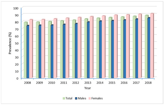 Overall, the prevalence was significantly higher in females than males (87.7% vs. 82.6%, p < 0.0001), and in adults (84.7% vs. 77.2%, p < 0.0001), including those aged 20–69 years (89.2% vs. 81.4%, p < 0.0001). Conversely, a higher prevalence rate was found in males (74.8 vs. 69.4%, p = 0.001) in the age group 0–14 years (Figure 1).