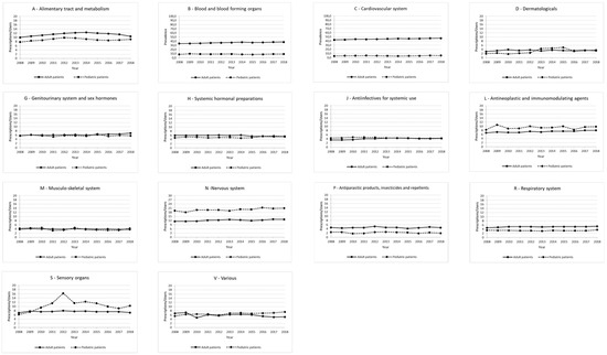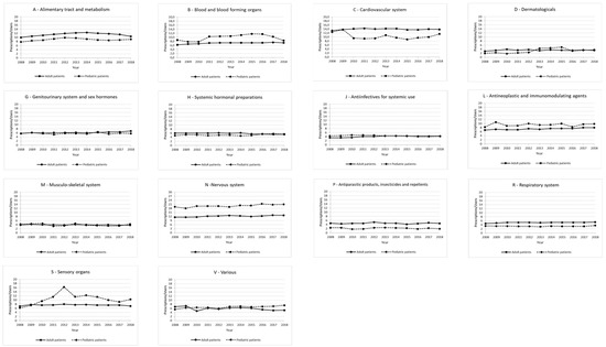 Among the adult RD patients, the therapeutic categories with the highest prevalence of use were Group A (alimentary tract and metabolism), with values ranging from 53.8% in 2008 to 61.2% in 2018 and Group J (antiinfectives for systemic use), characterized by values between 55.9–59.1% over the study period (Figure 3). Group M (musculo-skeletal system) was instead characterized by a slight decrease in the prevalence of use (from 38.3% in 2008 to 31.7% in 2018). Group H (systemic hormonal preparations, excluding sex hormones and insulin), Group N (nervous system) and Group R (respiratory system) had approximately steady trends (ranges between 39.8–41.7%, 38.8–41.8%, and 22.2–24.2%, respectively). On the other hand, the therapeutic groups with the lowest percentages of users were: Group D (dermatologicals), Group P (antiparasitic products, insecticides and repellents, with antimalarials representing 77.9% of prescription prevalence in this category), and Group V (various; users-of-medical-gases subgroup accounted for 54.8% of total users in this category in 2018), whose values increased from 0.8% in 2008 to 3.6% in 2015 (Figure 3).