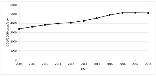 Considering the entire study period, the drug consumption registered a progressive increase from 3396.6 DDD/1000 cases per day in 2008 to 5152.5 DDD/1000 cases per day in 2016, followed by a steady profile in the last two years (5199.8 DDD/1000 cases per day in 2018) (Figure 6).