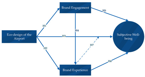 However, in the context of airports, little is known about the attributes of customer well-being after the implementation of eco-design in airport buildings, such as eco spaces, living plants, green décor and green atmospherics [13,14]. It has previously been shown that adopting an eco-design would help provide a relaxing consumption environment that supports consumers’ perceptions of well-being [12]. In this vein, travelers’ perceptions of subjective well-being is referred to as the extent to which a given brand would positively contribute to enhancing the impact of quality of life of the service provided by the airport [15]. Subjective well-being is related more to self-evaluation of life satisfaction and happiness, rather than being an objective measurement of economic and health aspects and other well-being attributes [16]. Customer well-being may also be connected to brand-related variables, such as engagement with the airport brand and the overall experience of passengers [11]. Experience is a key element in developing positive memories and experience has frequently been cited in studies focusing on experience as a driving force of the market [17]. As with other industries, experience in the tourism sector is referred to as the interaction between the company and the consumer that elicits emotional interactions providing memorable services [18]. From another perspective, brand engagement has been identified as the level of connection and interaction between consumers and a brand. Consumers’ engagement with a brand has evolved as a channel through which a consumer forms a passion for a brand, and develops an individual disposition that builds commitment towards a relationship with the brand [19]. Customer experience and engagement can both serve as important catalysts for high customer satisfaction and better business outcomes [20]. Therefore, an interplay of customer engagement and experience, as well as customers’ well-being, should be a matter of research.
