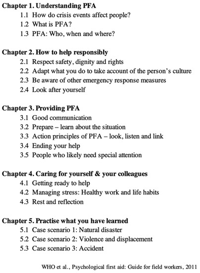 According to the Inter-Agency Standing Committee (IASC) Guidelines on Mental Health and Psychosocial Support in Emergency Settings [3], meeting basic needs and providing social support by the community and family members as well as non-professionals and professionals are considered critical to protect and promote mental health and well-being in emergencies. The Psychological First Aid (PFA) Guide for Field Workers [5] was developed as a result of collaboration among UN agencies and international non-governmental organizations (NGOs) as a key component of achieving them. PFA involves “humane, supportive and practical help to fellow human beings suffering from crisis events” [5]. PFA is based on the principle of “do no harm” and is not limited to professionals only. PFA has been actively implemented with a focus on enhancing prevention, response, recovery, and resilience in disaster-prone regions, including the Asia–Pacific region. Figure 1 shows the key components of PFA indicated in the table of contents of the PFA Guide [5].