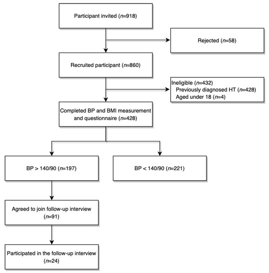 The inclusion criteria of the qualitative interview were patients (1) who had not screened for HT in the previous two years; and (2) who had been found to have elevated BP during the BP measurements as part of the quantitative survey. Patients meeting the inclusion criteria were further sampled based on age, gender, marital status, employment status, clinical visit in the past two years, and self-perceived HT condition.