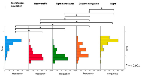 Finally, we tested the effect of shipping conditions on sleepiness frequency. A Friedman test followed by post-hoc tests were carried out and adjusted using the Bonferroni correction to examine the effect of navigation contexts on sleepiness frequency. Results showed that the context of navigation leads to statistically significant differences in sleepiness occurrence (Q = 420.891, p < 0.001). As expected, sleepiness was more frequent at night than during the day (p < 0.001). Sleepiness was less frequent during periods of activity (traffic or tight passage) than in other conditions (p < 0.001). Sleepiness during monotonous passages had a frequency that was not significantly different from that experienced at night (p = 0.082). Results are presented in Figure 1.