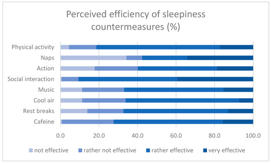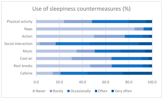 Social interaction is considered an efficient countermeasure (classified as “rather effective” or “very effective”) by 90.6% of the respondents, followed by physical activity (81.3%), caffeine (72.4%), rest breaks (67.3%), music (66.9%) cool air (66.1%), and naps (57.5%). It is noteworthy that napping is considered a “very effective” way of counteracting sleepiness by 34.2% of respondents, second to social interaction which has the largest proportion of “very effective” ratings (39.4%). Figure 3 depicts the complete distribution of answers.