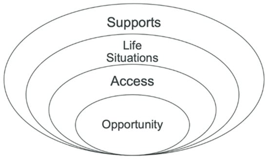 Similar to Mahar et al. Allen and colleagues [27] define belonging as the subjective perception or feeling one experiences when surrounded by family, friends, school, work environments, communities, cultural groups, and physical places. Belonging can be promoted or hindered by people, places, and experiences that interact with an individual’s characteristics, culture, past experiences, and identity [27]. Thus, belonging can occur in a variety of contexts as long as that context provides the appropriate support. Allen [27] suggests that belonging is made up of four interrelated components that are supported by systems with which the person interacts: competencies for belonging (skills and abilities); opportunities to belong (enablers, removal/reduction in barriers); motivations to belong (inner drive); and perceptions of belonging (based on past experiences). Systems can support or hinder the expression of these components.
