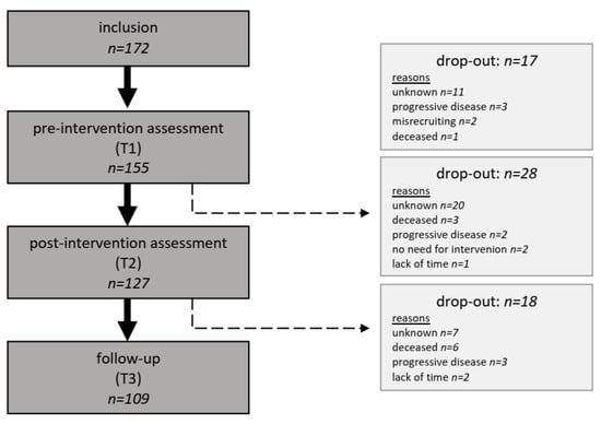 From June 2020 to September 2020, a total of 172 patients were recruited. Due to drop-outs (n = 17) before the first assessment, our initial sample comprised 155 patients. A further 46 patients were lost until follow-up. Therefore, our analysis refers to patients with data on all assessment points (n = 109). For details on the study flow, see Figure 1. Drop-out analysis was performed for the sociodemographic and clinical variables. The results indicate no systematic sample bias because of patient drop-out. However, significantly more dropouts had metastasis (p < 0.001), were under tumor therapy (p = 0.015), or received palliative care (p < 0.001) than the completers.
