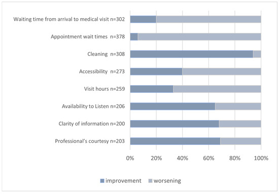 Regarding aspects of organizational, environmental, and relational quality, 57% of participants (n = 500) reported changes related to the COVID-19 pandemic. In particular, among women who reported improvement or worsening due to the COVID-19 pandemic, as reported in Figure 1, waiting times, appointment hours, and accessibility were perceived as worsening, while most participants perceived cleaning and relational quality as improving.