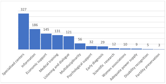 At the end of the interview, the participants were asked to report their needs through an open-ended question. In total, 323 women did not respond to the survey. Moreover, some respondents (n = 722) provided one or more suggestions: 327 (45%) declared that it was necessary to have a specialised centre for endometriosis, 20% (186/722) requested more information about endometriosis disease and management, and 17% (145/722) needed economic support (Figure 2).