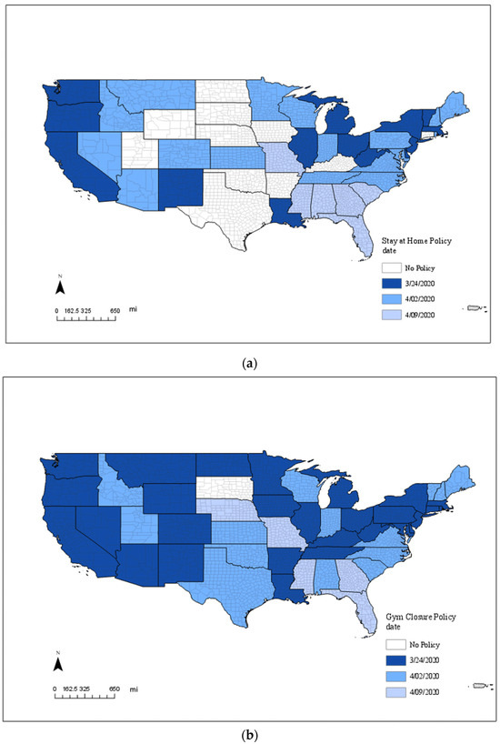 Policies requiring the closure of entertainment facilities and gyms were implemented between 16 March and 3 April 2020. South Dakota was the only state not implementing an entertainment facility and gym closure policy. More information about the spatial-temporal distribution of entertainment facilities and gym closure policies can be found in Figure 1b. Regarding public school closures, all U.S. states had implemented policies closing public schools between 16 March and 3 April 2020. On 16 March 2020, the first day of public school closures, 20 states, including Alaska and Hawaii, issued this policy. Detailed information about the spatial-temporal distribution of public school closures can be found in Figure 1c.