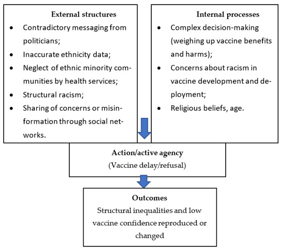Within critical realist social theory, the social world is a layered, complex and open system consisting of people (agents) actively and reflexively drawing upon both their attitudes and knowledge (internal structures) and social interactions (external structures) to generate behaviours [22,23,24]. People belong to and are influenced by multiple institutions and structural relations, which can facilitate the sharing of common concerns and make people reflect and act differently [17]. The use of critical realist social theory allowed us to identify the complex interactions between people and social structures and a possible causal pathway for how this may influence COVID-19 vaccine confidence. This is presented in a summary framework.