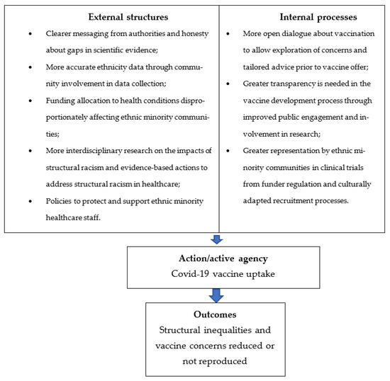 Recommendations, therefore, address social factors that contribute to ethnic inequalities. The thematic framework based on structuration theory has been used to develop recommendations for policy-makers and healthcare professionals to improve confidence in COVID-19 vaccination in ethnic minority groups (see Figure 2).