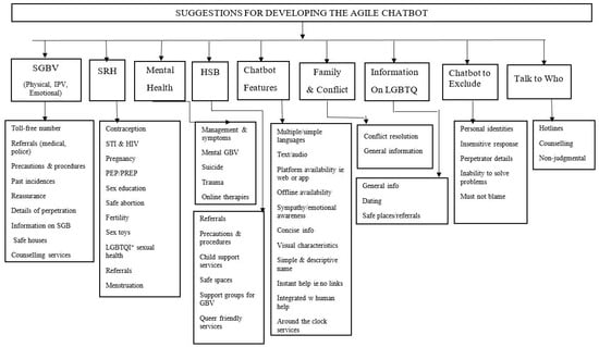 The analysis resulted in 14 salient themes composed of sexual violence and female genital mutilation, physical violence, emotional violence, intimate partner violence, sexual and reproductive health, mental health, help-seeking behaviors/where to seek support, who to talk to, and what information they would like, features of the chatbot, access to the chatbot, abuse and HIV, family and community conflicts, and information on LGBTQ issues.