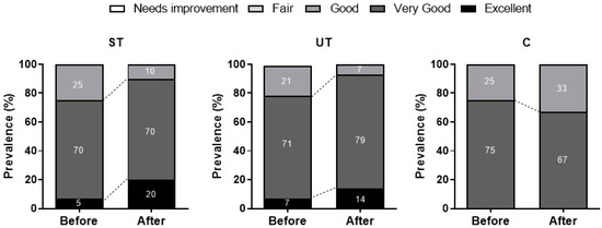Finally, Figure 1 illustrates the analysis of the questionnaire among the groups (ST, UT, and C) regarding the % prevalence before and after the 12 weeks of training. Positive outcomes were observed among the supervised and unsupervised training groups, indicating that, overall, the subjects displayed an adequate lifestyle with scores ranging from “Good” to “Excellent”, in contrast to the non-training group. Our findings are consistent with other studies involving physical activity practitioners who demonstrated an appropriate lifestyle according to the classification of the administered questionnaire [44,49]. Thus, our results emphasize the importance of engaging in physical exercise, whether supervised or unsupervised, for maintaining a positive lifestyle among the elderly.