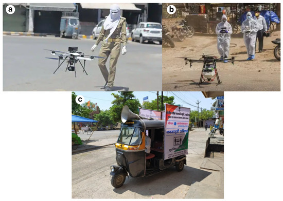 (a) Drones used for surveillance [47]; (b) drones used for sanitation [48]; (c) public addressing systems (PAS) [51].
