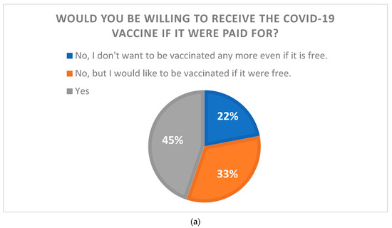 We conducted a survey to determine how much the general public would be willing to pay for the COVID-19 vaccine if it were available at a fee, and the findings revealed that more than half of the respondents were unwilling to pay for the COVID-19 vaccine. Of these, 22% did not want to be vaccinated even if the vaccine was free. The 22% refusal is not exceptional; in many countries, approximately 20% of people refuse to be vaccinated [21,22]. Despite the widespread provision of COVID-19 vaccines and strong evidence of their efficacy [23,24], many individuals continue to express hesitancy regarding COVID-19 vaccines [20,25,26,27]. The most common reasons for this refusal were as follows: being against vaccines in general, concerns about safety or thinking that a vaccine produced in a rush is too dangerous, considering the vaccine useless because of the harmless nature of COVID-19, general lack of trust, doubts about the efficacy of the vaccine, belief in being already immunized, and doubt about the provenience of the vaccine [28]. Hesitation toward vaccines, not just the COVID-19 vaccine, is among the most important public health issues of concern for the World Health Organization (WHO) [29]. Studies have been conducted to explore factors from various perspectives regarding vaccine hesitancy, and the WHO Strategic Advisory Group of Experts (SAGE) on Immunizations defined the 3C framework, which initially spoke of vaccine confidence, complacency, and convenience [30]; later additions included calculation and collective responsibility, turning the framework into the 5C model [31]. As outlined in the model, confidence (level of trust in the safety and effectiveness of vaccines, the health system that delivers them, and the drive of policymakers who decide on the needed vaccines), complacency (low perceived risks of vaccine-preventable diseases), convenience (logistics such as availability, cost, accessibility, service quality, and uptake), calculation (active information-seeking of risks/benefits), and collective responsibility (willingness to protect others) are factors that impact vaccine hesitancy [32]. Accordingly, this study was conducted to determine the level of acceptable cost burdens in the “cost” section of the survey and found that more than half of the respondents did not like to bear the cost burden. While 20% of them are vaccine refusers who do not want to be given the vaccine even if it is free, the rest would be willing to be given the vaccine if it were free.