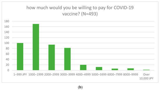 Overall, 607 (55.2%) of the 1100 respondents indicated that they would not want to receive the COVID-19 vaccine if they had to pay for one. Of them, 365 indicated that they would be willing to be vaccinated if the vaccines were free. Another 493 (44.8%) participants stated that they would be willing to receive the COVID-19 vaccine even if they were charged for it. Those who would be willing to pay for the COVID-19 vaccine were asked how much they would be willing to pay for the COVID-19 vaccine. The largest number of respondents (170) answered between 1000 JPY (≈USD 7.7) and 1999 JPY (≈USD 15.4). Only two respondents answered over 10,000 JPY (≈USD 77) for COVID-19 vaccination (Figure 1).