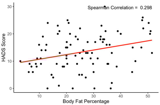 Correlation between body fat percentage and HADS score. Note. N = 90. Every percentage increase in body fat correlates with an average HADS score increase of 0.16 (p = 0.0044).