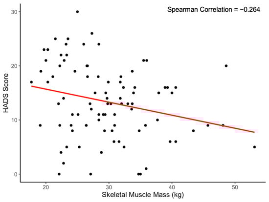 Correlation between skeletal muscle mass and HADS score. Note. N = 90. Every kilogram increase in skeletal muscle mass correlates with an average HADS score decrease of 0.24 (p = 0.012).