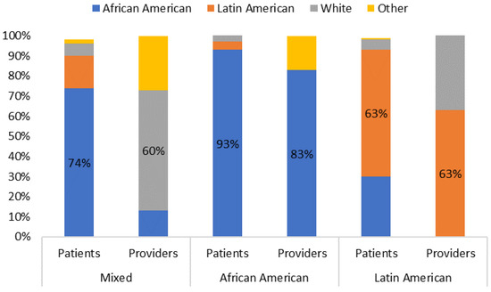 The effect modifier was the clinical site, which included the multi-ethnic clinic (referent category), the predominantly LA clinic, and the predominantly AA clinic. The respective racial/ethnic compositions for the patients and providers of the selected clinics are detailed in Table 2 and Figure 1. We refer to the multi-ethnic clinic as the site where the predominant racial/ethnic group differs for patients (74% African American), and providers (60% White). We refer to the AA or LA clinics as sites where the predominant racial/ethnic groups for patients and care teams are the same, either AA (with patients and providers being 93% and 83% African American, respectively) or LA (with patients and providers both being 63% Latin American).