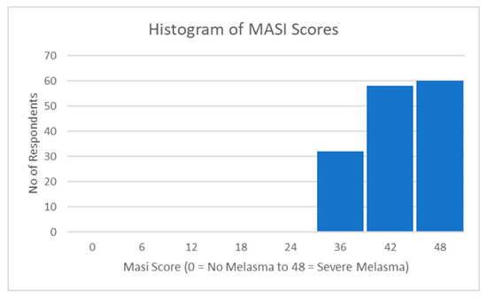Other studies which analyzed the relationship between the MASI and MELASQoL suggested that there is a statistically significant correlation between the two scores [7,29,31,32,71,72]. Hence, our study showed that MASI and MELASQoL scores were statistically correlated (R = 0.222) (Table 6). However, contrary to this popular view, some studies have shown an unrelated or weak correlation between MASI and MELASQoL [8,33,34,37,44,70,73]. Thus, the relationship between the MASI and MELASQoL scores is mixed. Clinical severity should not be the only criterion used to assess the burden of patients’ skin conditions. The MASI score is based on “feelings”, and since they change according to the situation, “feelings” lack a clear criterion of evaluation. Even when melasma is not severe, it can cause emotional stress, potentially reducing patients’ quality of life. Given the present study, it is evident that melasma has a significant negative impact on a patient’s QoL. The MELASQoL may not be an ideal tool to measure QoL as it mainly focuses on emotions, which makes the measurement subjective. Previously, a more objective instrument that examines the severity of melasma has been proposed. The new modified MASI (mMASI) score is based on the measurement of darkness and area of involvement in identifying melasma severity, and since homogeneity is unreliable, it has been removed from the new modified MASI score [74]. In assessing the severity of melasma, most authors have agreed that the mMASI score is reliable, accurate, and responsive to change. Furthermore, the mMASI score has been demonstrated to be easier to acquire and perform, as well as simpler to calculate, than the MASI score [75,76,77]. Thus, the mMASI score can successfully substitute the MASI score.