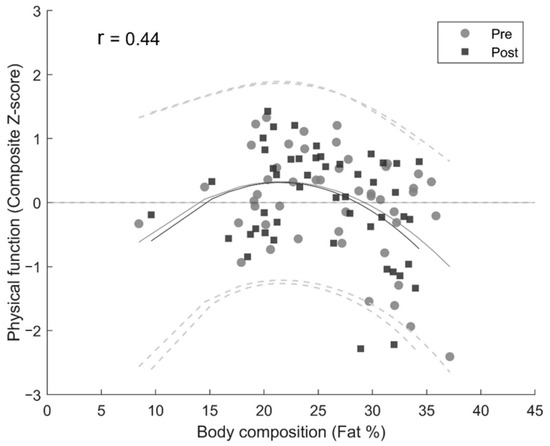 Moreover, declines in physical function due to ageing and changes in body composition co-occur [6]. For instance, excessive body fat accumulation represents additional body mass that provides no additional contribution to movement performance and potentially restricts physical function due to the energy cost of moving the enhanced load [7,8]. Nonetheless, there are conflicting results with respect to whether the decrease in lean mass or increase in body fat is associated with impaired physical function. Despite the fact that some cross-sectional studies have reported a positive association between lean mass and physical function in older adults [9,10], other cross-sectional studies have reported no association between lean mass and physical function but a clear negative association between body fat and physical function [7,11,12,13]. However, most studies have concentrated on overweight/obese individuals and have not investigated potential non-linear relationships [9,10,11,12,13]. Notably, a study by Hardy et al. [14] demonstrated a non-linear relationship between body composition (estimated using Body Mass Index (BMI)) and physical function in older adults, indicating that neither excessive nor too-low body fat levels are beneficial for physical function.