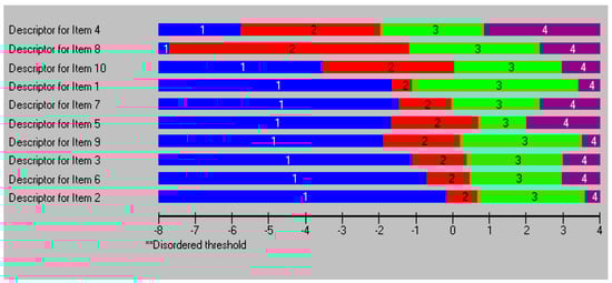 The item threshold map showed ordered thresholds for all 10 items. All four response categories had a point on the latent continuum that was the most likely response option to be chosen (Figure 1). Items 4 and 8 were the easiest items to endorse, while items 2 and 6 were the hardest items to endorse.